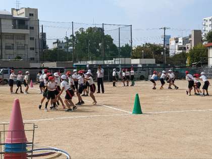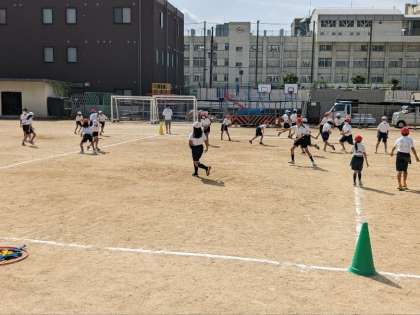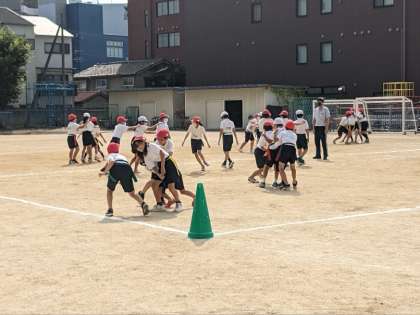 体育の授業の様子です。運動場でしっぽ取りのゲームをしていました。練習の後試合をしました。攻める守るを交代して試合をします。走力と敏捷性が問われるスポーツです。楽しいですよ。