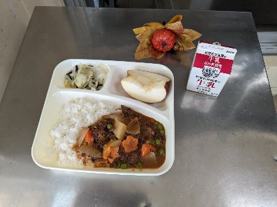 今日の献立は、ハヤシライス【米粉】・キャベツのひじきドレッシング・りんご・牛乳です。