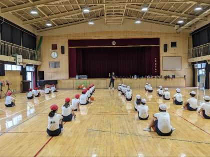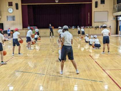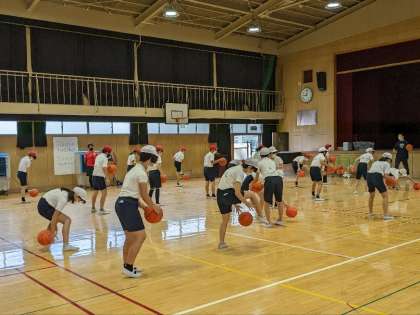 体育の授業の様子です。講堂でバスケットボールの学習をしていました。基本的なドリブルの仕方を練習していました。片手や両手を使ってのドリブル、足の間を通すドリブルなどを学んでいました。うまくなるには練習しかありません。がんばりましょう。