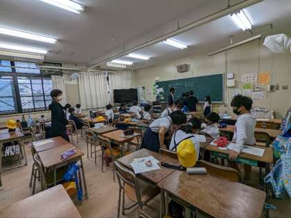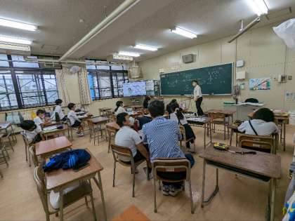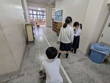 算数の授業の様子です。平均の学習をしていました。自分の歩幅の平均を使って、音楽室までの距離を調べていました。予測が正しいかどうか、メジャーを使って実際に測っていました。結果はどうだったでしょうか。