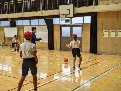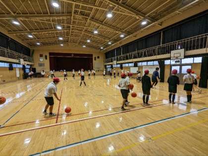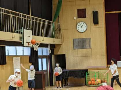 体育の授業の様子です。講堂でバスケットボールをしていました。連係プレーによるシュートの練習です。パス・ドリブル・シュートどれも必要なスキルです。しっかり身につけましょう。