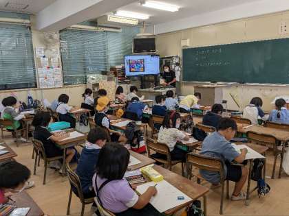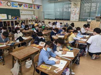 図画工作科の授業の様子です。パスを使って画面いっぱいにモンスターを描いていました。かわいらしいモンスターやこわそうなモンスターまで、個性があふれていました。