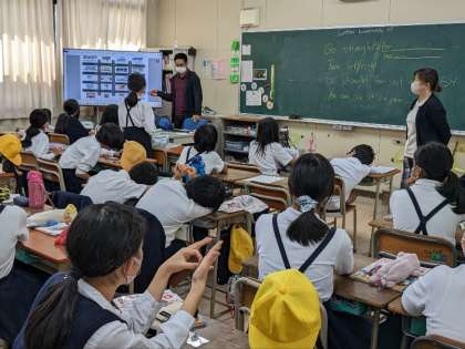 英語の授業の様子です。道案内の仕方を学んでいました。画面を指で刺しながら英語で説明していました。実際に道案内ができるといいですね。