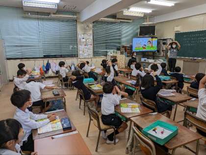 算数の授業の様子です。たし算の学習をしていました。画面で数を確認しながら問題を解いていました。しっかり考えて計算することは大切ですね。