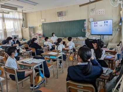 社会科の授業の様子です。NHKオンデマンドで歴史のテレビを見ていました。関ヶ原の合戦のころの歴史です。みんなは集中して見ていました。多くの人にとって一番興味がある時代ではないでしょうか。秋の夜長に子ども達と歴史談義をされてはどうでしょう。徹夜で語りあったりして・・・。