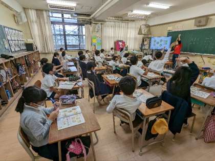 外国語活動の授業の様子です。聞き取りのクイズをしていました。画面を見て音声を聞き分け、答えを積極的に発表していました。