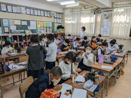図画工作科の授業の様子です。ハロウィンの飾りを作っていました。どれも個性的で楽しい作品です。作っている子ども達も楽しそうでした。
