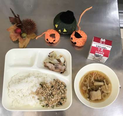 今日の献立は、鶏肉のゆず塩焼き、ソーキ汁、ツナ大豆そぼろ、ごはん、牛乳です。「ソーキ汁」の「ソーキ」は豚のあばら肉のことで、沖縄では大切な食材です。水でじっくり煮込んだソーキ骨をしょうゆなどで味付けした煮込み料理で、「ソーキそば」にも使われます。