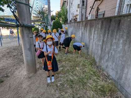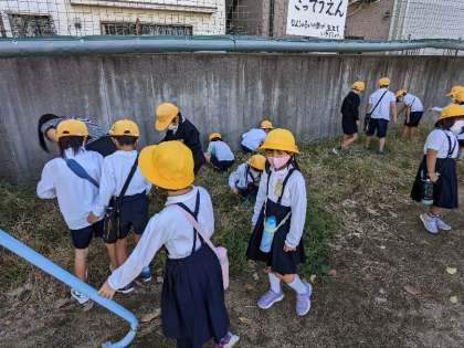 生活科の授業の様子です。運動場の隅で虫や木の実を探していました。狭い場所ですが、虫や木の実が見つかりました。すごいですね。公園に行くともう少し見つかるかもしれませんね。