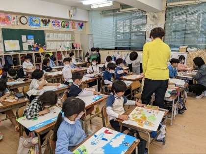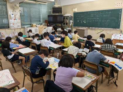 図画工作科の授業の様子です。作成中の「魔法使いになったら」の絵に、自分を描いていました。どこにするか考えながら描いていました。出来上がりが楽しみですね。