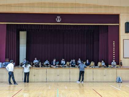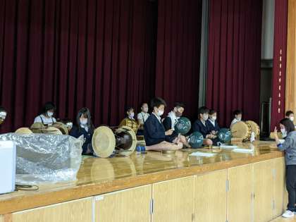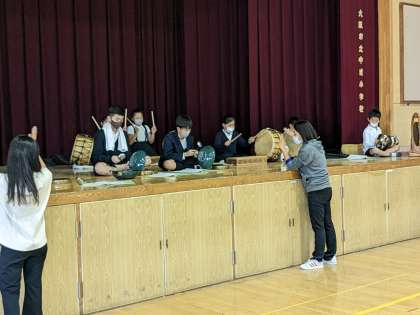 講堂で民族クラブの活動を行いました。発表会に向けて、最初から通して練習をしました。今日は、楽器に加えて調理器具等を使って演奏しました。使うと音が柔らかくなりました。