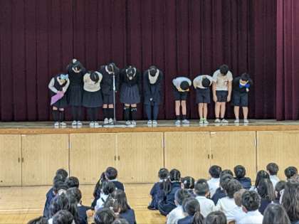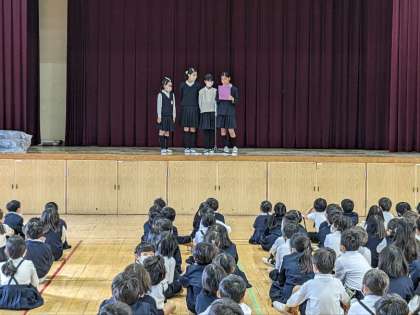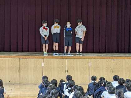 講堂で児童集会を行いました。今日は図書委員会の集会でした。漫才で本の紹介をしていました。とても面白く、あちこちで笑いが起こっていました。とても楽しい集会になりました。