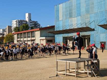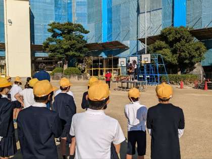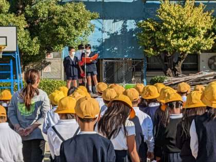運動場で全校朝会を行いました。先ずは秋晴れの爽やかな日差しの下、姿勢ストレッチを行いました。校長先生のお話に続いて、看護当番から先週の反省と今週の目標についての話がありました。