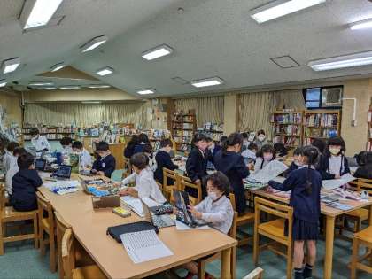 国語の授業の様子です。図書室で調べ学習をしていました。図鑑やパソコンを使って動物を調べていました。それをプリントにまとめていました。