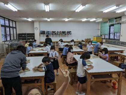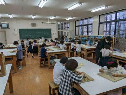 図工室で陶芸作品を作っていました。名前のプレートを作っていました。陶芸展の作品になるのではないかと思います。うまく仕上がるといいですね。
