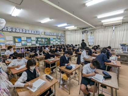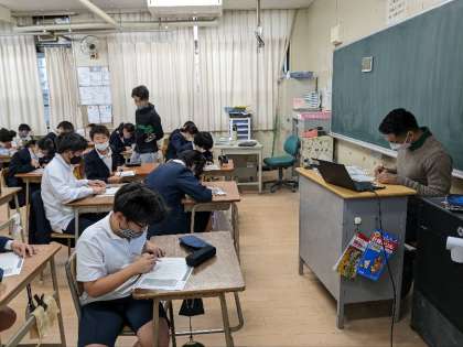 英語の授業の様子です。単語クイズにチャレンジしていました。いっぱい書かれたアルファベットの中から単語を見つけ出すクイズです。難しいかったようですががんばっていました。