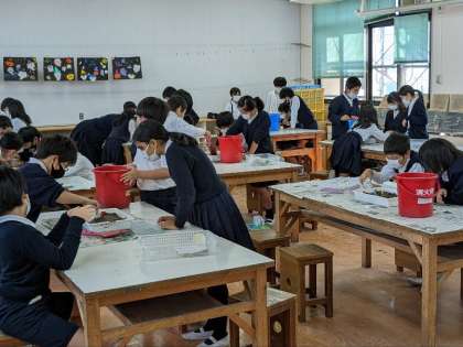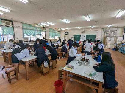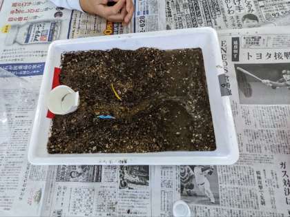理科の授業の様子です。図工室で流れる水のはたらきの実験をしていました。グループに分かれて斜面に水をかけていました。とても楽しそうに実験をしていました。予想通りの結果になったのでしょうか。