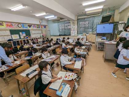 算数の授業の様子です。くり上がりのあるたし算に挑戦していました。1つの数を2つに分けて、たして10になるようにします。残った数を1の位にもってくると答えです。覚えるまでややこしいですが、できれば早く答えが見つかります。がんばりましょう。
