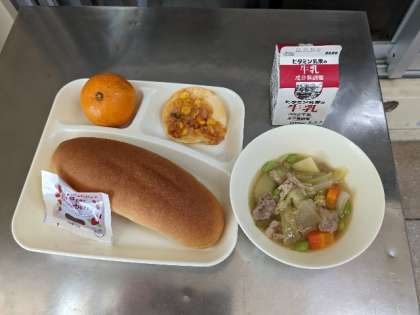 今日のメニューは、豚肉と野菜のスープ煮・変わりピザ・みかん・コッペパン・イチゴジャム・牛乳です。