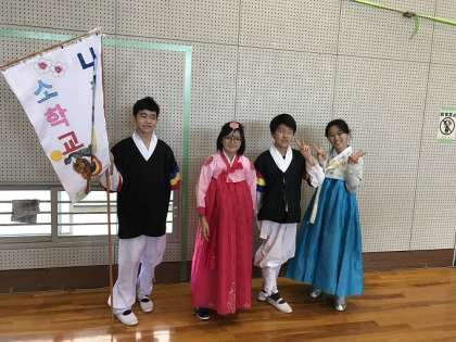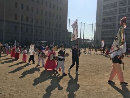 生野区の桃谷高校で東部子ども民族文化祭が行われ、中道小学校からも5.6年生の3人が参加しました。チョゴリに着替えて運動場で大プンムルノリ(農楽)を参加者全員で演奏し行進した後、体育館で小中の発表校の演技を鑑賞したり、全員でアリランを踊ったりしました。
