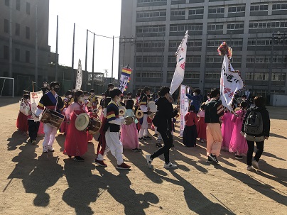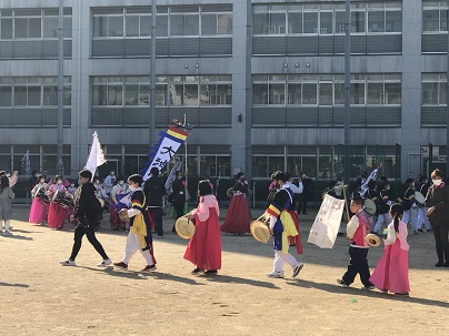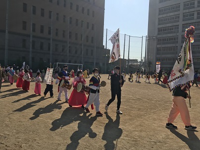 桃谷高校運動場での全校そろっての行進の様子です。民族衣装をまとって行進しました。いろいろな学校の友達を交流をしました。
