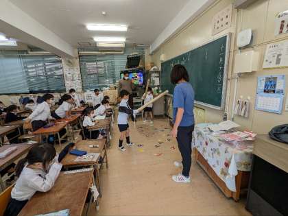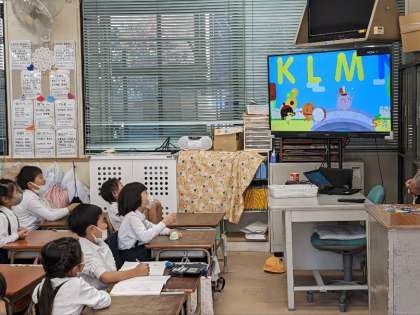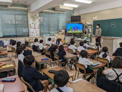 外国語活動の授業の様子です。子ども達は、アルファベットの歌に合わせて元気に歌っていました。ペースが速くなってもしっかりついていって歌っていました。また、子ども達は夢中になってアルファベットの書かれた魚釣りゲームに挑戦していました。釣り上げたときは大きな歓声が上がりました。