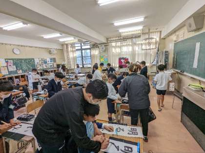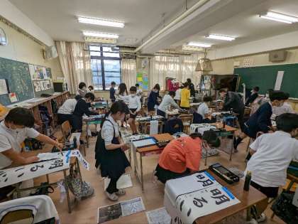 書写の授業の様子です。毛筆で「明るい心」と書いていました。この作品も陶芸展に出品される作品です。気合を入れて書きましょう。