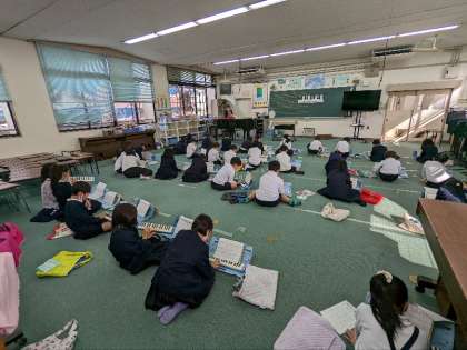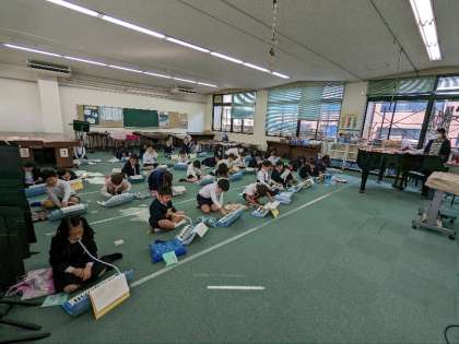音楽の授業の様子です。鍵盤ハーモニカで合奏をしていました。先生のピアノの伴奏に合わせて集中して演奏していました。とても上手でした。