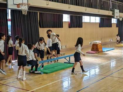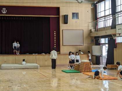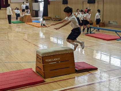 体育の授業の様子です。講堂で跳び箱を使った運動をしていました。跳び上がったり、降りたり等いろいろな動きをしていました。いろいろな運動スキルを身につけていきましょう。