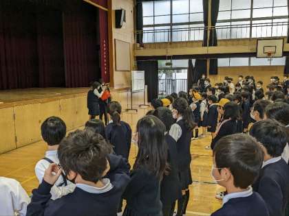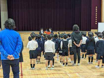 校長先生から、東部民族文化祭に参加していただいた感謝状の紹介がありました。続いてのお話(ワールドカップ・勤労感謝の日)の後、看護当番から先週の反省と今週の目標についての話がありました。