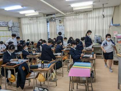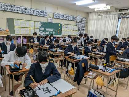 書写の授業の様子です。毛筆で作品を作っていました。それぞれが思い思いの字を書いていました。それを色画用紙に貼るようです。どんな作品ができるのか気になりますね。見るのが楽しみです。