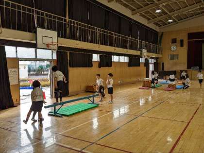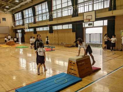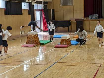 体育の授業の様子です。講堂で跳び箱や平均台などの器械を使った運動をしていました。子ども達は、いろいろな運動にチャレンジしていました。全部クリアできるといいですね。