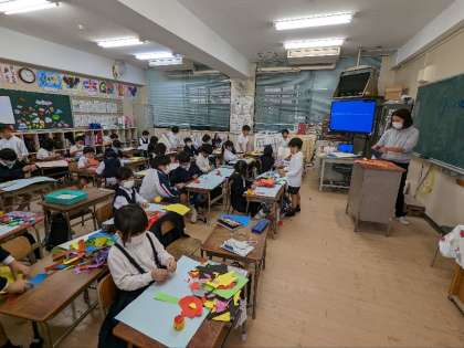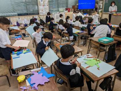 図画工作科の授業の様子です。ちぎり絵を作っていました。ちぎった色紙などが、想像力を働かせて何に見えるのかを考え、画用紙に貼っていきます。どんな作品になるのか楽しみですね。