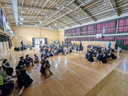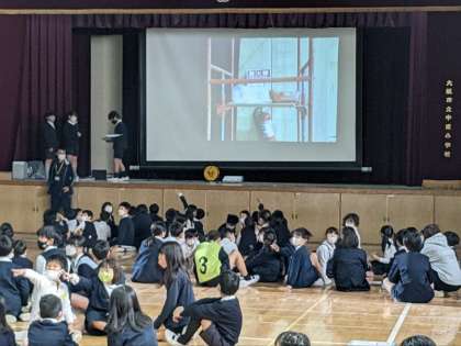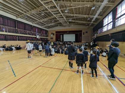 講堂で児童集会を行いました。今日は、「ここはどこでしょう」というクイズでした。校内で撮った画像がどこであるかを当てるクイズでした。本当に一部分を撮った映像でしたが、多くの班が全問正解でした。