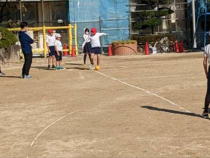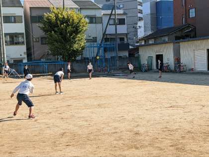 運動場でキックベースボールの試合をしていました。ポジションを移動したり、作戦を考えながら試合をしていました。見ごたえがありました。