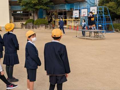 運動場で全校朝会を行いました。健康委員会からのストレッチのあと校長先生からお話がありました。続いて看護当番から、先週の反省と今週の目標が発表されました。