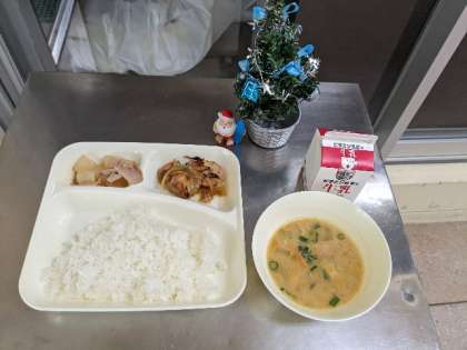 今日の献立は、鶏肉の甘辛焼き・みそ汁・だいこんの煮もの・ごはん・牛乳です。