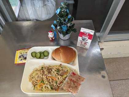 今日の献立は、和風焼きそば・きゅうりのしょうが漬け・いり黒豆・黒糖パン・牛乳です。