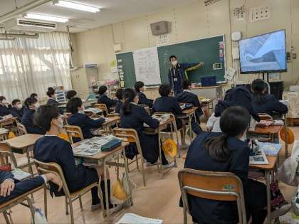 理科の授業の様子です。地殻について学んでいました。映像を見ながら断層について考えていました。この授業には映像が役立ちますね。どこかに出かけたとき目にすることができればいいですね。