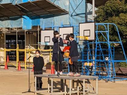 穏やかな冬晴れの朝、運動場で全校朝会を行いました。健康委員会の姿勢ストレッチの後、校長先生からサッカーボールと児童書をいただいたお知らせがありました。その後に、看護当番から先週の反省と今週の目標についての話がありました。