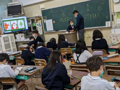 外国語活動の授業の様子です。C−NETの先生とクリスマスカードを作っていました。みんなかわいいカードを作っていました。誰にプレゼントするのかな?気になりますね。