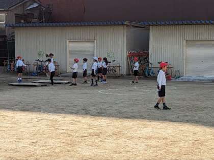 体育の授業の様子です。運動場で縄跳びを使った運動をしていました。個人で、グループで練習をしていました。器具を使って練習している子たちもいました。それぞれの目標に向かってがんばりましょう。