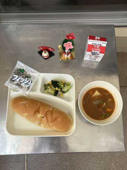 今日の献立は、ビーフシチュー、ブロッコリーとコーンのサラダ、ミニフィッシュ、おさつパン、牛乳です。給食はたくさんの人の協力によってつくられています。感謝の気持ちを、追って。大切にいただきましょう。