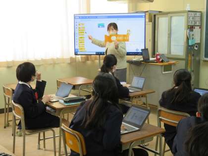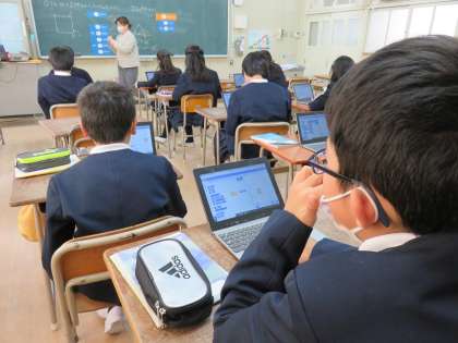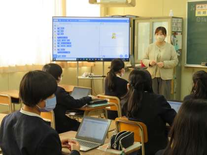 算数の授業で、プログラミングソフト「スクラッチ」を使って、正多角形をつくる学習をしました。先生が手にしたり、黒板に貼ったりしている図は、SSS(スクールサポートスタッフ)の方の制作です。わかりやすく説明できます。