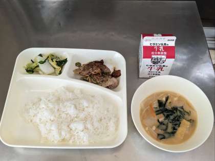 今日の献立は、豚肉のごまだれ焼き・みそ汁・きくなと白菜のおひたし・ごはん・牛乳です。
