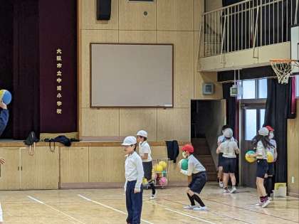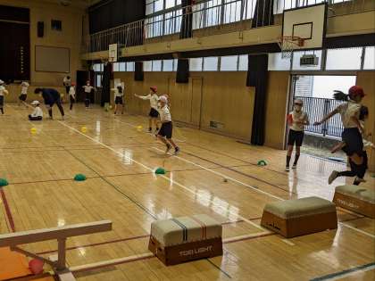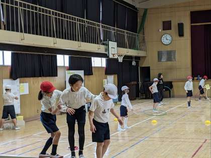 体育の授業の様子です。講堂でいろいろな運動にチャレンジしていました。平均台やボール、とび縄など多くの器具を使って、どの運動も楽しそうでした。一緒にやってみたくなりました。
