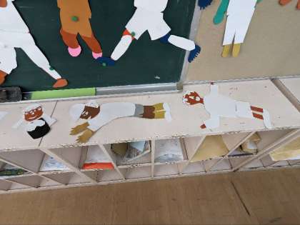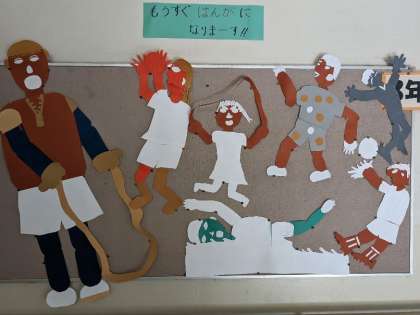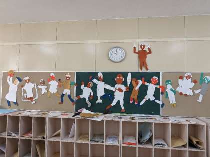 3年生が紙版画をしています。インクをつける前の台紙を展示しています。人の動きが上手に表現されています。この作品は今しか見ることができません。