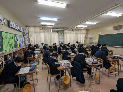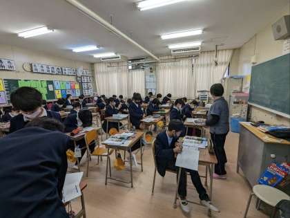 社会科の授業の様子です。近世の年表を書いていました。オリンピック・パラリンピックのことも書いていましたが、戦争のことも書いてありました。これから先に起こる出来事は、幸せなことばかりだといいですね。