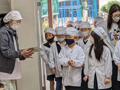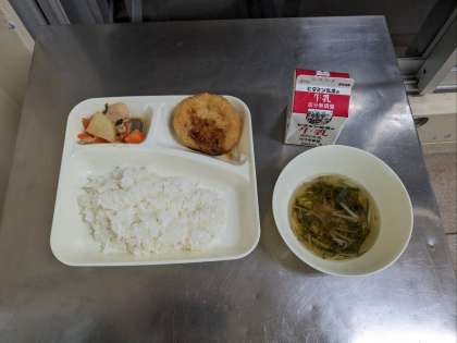 今日の献立は、鶏肉の土手焼き風・はりはり汁・れんこんのフライ大阪ソース味・ごはん・牛乳です。今日も静かにしっかり楽しく食べましょう。