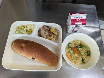 今日のメニューは、中華おこわ・卵スープ・キャベツのオイスターソース炒め・レーズンパン・牛乳です。